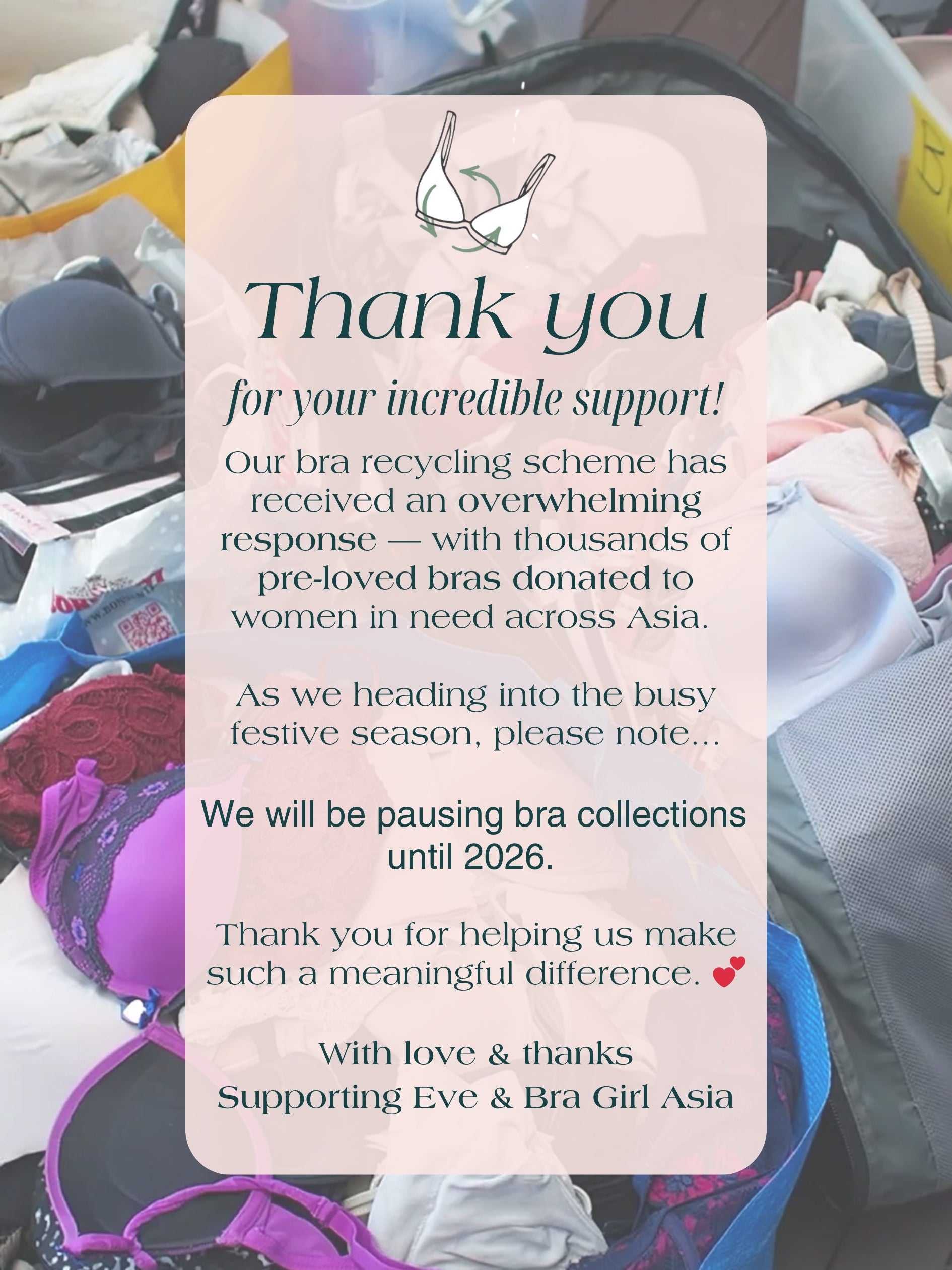 We’re so grateful for the thousands of bras you’ve donated through our recycling scheme in 2025 — helping women in need and reducing textile waste.